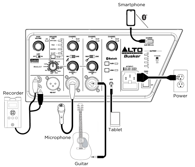탑재된 믹서는 총 4채널 입력(마이크 및 악기 입력 2채널, 스테레오 1채널)의 용량이며 여기에 간편하게 조정할 수 있는 FX 노브, 그리고 스피커의 용도에 따라 최적화된 사운드를 만들어주는 간단하지만 정밀한 스피커 매니지먼트 DSP까지 내장했으며 여기에 더 넓은 공간에서의 추가 출력을 위한 mix 출력 단자까지 내장했다. 이 출력 단자를 통해 사용자는 추가 믹서 없이도 두 대, 혹은 그 이상의 Alto Busker 혹은 또 다른 스피커로 시스템을 확장할 수도 있는 것. 여기에 마이크 입력단자에는 이 급에서는 보기 드물게 +48V 트루 팬텀파워를 탑재하여 고감도/고성능의 콘덴서 마이크로폰까지 사용할 수 있도록 준비했다.