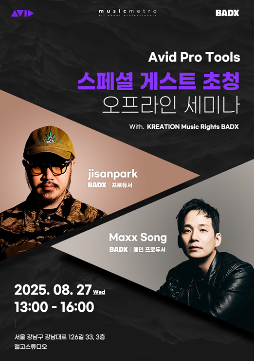 (주)뮤직메트로가 K-POP 히트메이커와 함께 Avid Pro Tools 오프라인 세미나를 개최한다고 밝혔다. Avid Pro Tools 오프라인 세미나는 8월 27일(수) 오후 1시부터 4시까지 서울 강남구 앨고스튜디오에서 열릴 예정이다. 특히, 이번 세미나는 K-POP 제작 현장에서 직접 활동하는 프로듀서들이 전하는 생생한 노하우와 실제 프로젝트 비하인드를 들을 수 있는 드문 기회가 될 것이다. Avid Pro Tools를 활용한 고급 제작 기법부터 최신 음악 트렌드까지, 음악 제작자라면 놓치기 아까운 인사이트를 얻을 수 있을 것으로 기대를 모은다.